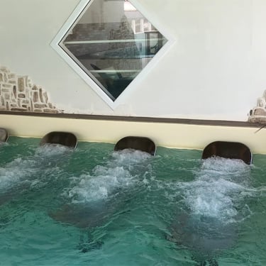 ✅ Espace détente chauffé en plein air : lits massants, geysers, bains à remous