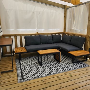 La grande terrasse en bois de 18 m² est couverte et fermée par des bâches amovibles sur rail pour profiter de l’extérieur quelle que soit la météo :