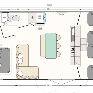 Découvrez notre mobil-home IRM Agora 3, modèle spacieux, moderne et parfaitement équipé, situé dans un coin calme et verdoyant du camping, en impasse, pour un maximum d’intimité.